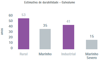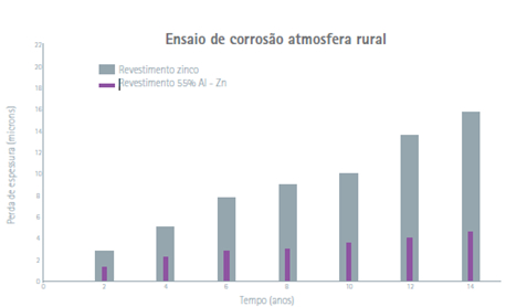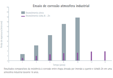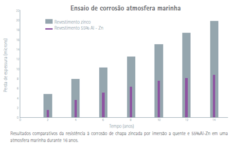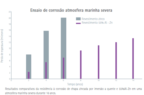 A partir de testes acelerados, exposições de amostras à atmosfera e acompanhamento de produto em serviço (por meio de inspeções periódicas realizadas em diversas construções), pôde-se constatar a performance superior do galvalume sobre o galvanizado no quesito resistência à corrosão. A vida útil do galvalume é duas a quatro vezes maior se comparada com a vida útil do aço galvanizado. Estes dados foram obtidos com base em amostras expostas em diversos ambientes na Europa, pelo período de quase 20 anos, e nos EUA, por um período superior a 30 anos.